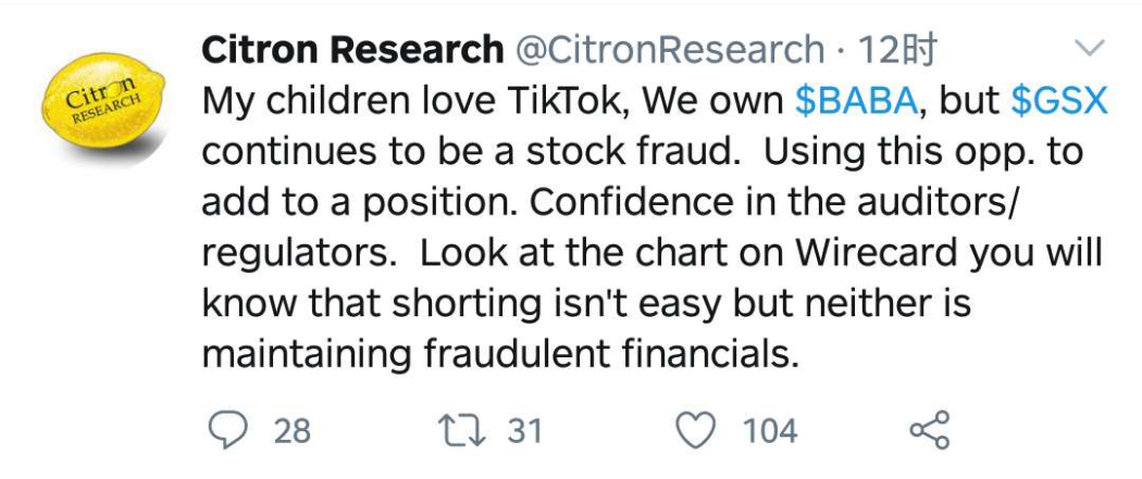 香橼在其官方推特上称:“我们的孩子爱TikTok,我们有阿里巴巴的股票,但是跟谁学一直是一个欺诈股票。利用这个机会增加做空仓位。我们对审计师和监管机构有信心。看看Wirecard的股价走势你就明白,做空难,维持财务造假更难。”