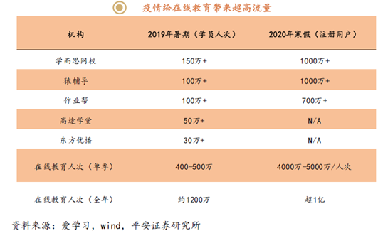 “停课不停学”政策为教培机构带来巨大的低成本流量,学员投入在线教育怀抱,在线教育平台流量井喷。平安证券在研报中表示,学而思网校、猿辅导获得了超过千万人流量,作业帮、跟谁学(高途)、新东方在线(优播)获取数百万人流量。