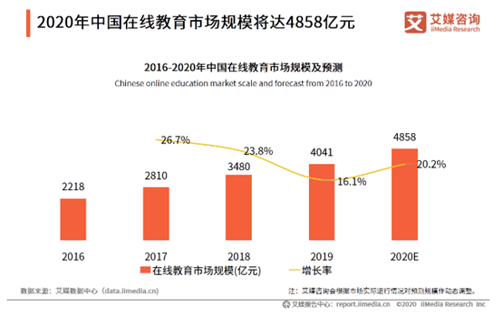 今年在疫情助推下,在线教育平台迅速崛起。根据艾媒咨询预测,2020年中国在线教育市场规模将增长20.2%至4858亿元,用户规模将达到3.51亿人,K12在线教育用户将超过3700万人。