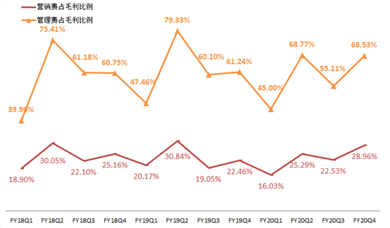 梳理过去3年每个季度的费用支出,可以看出,新东方可谓“保守派”,营销费用占毛利的比例基本可以控制在30%以下,管理费用占到5-7成。