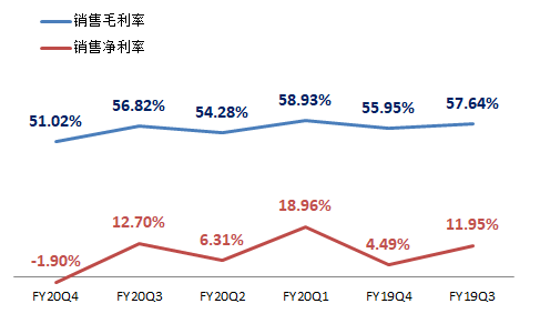 将范围扩大到新东方来看,虽然过去已经证明了线下培训的财务模型,但在线业务的盈利模式仍在摸索中,以及趋高的销售成本,拖累了整体业绩。新东方近年来的销售毛利率保持在50%左右,但销售净利率在低位徘徊,近6个季度以来都不超过20%,2020财年Q4降至-1.9%,创下新低。