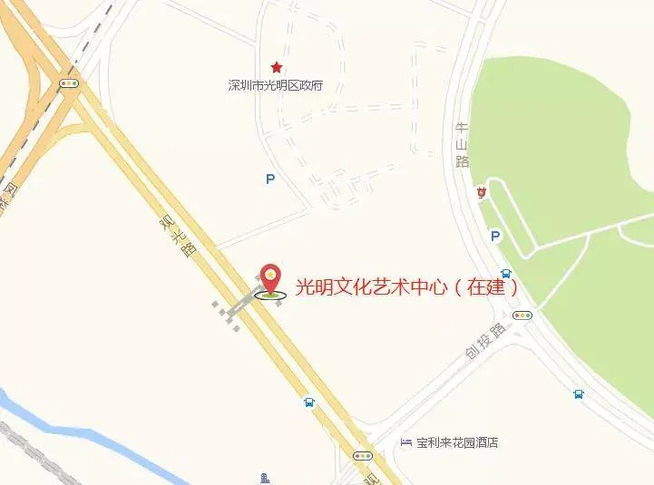 光明区图书馆新馆所在的光明文化艺术中心,是光明区首个大型综合文化场馆,位于光明区观光路东北侧,东南侧为创投路,东北侧为公园路。