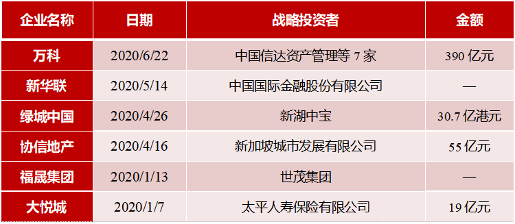 2020年以来,包括万科、绿城、泰禾、新华联等房企积极引入战略投资者,预计对房地产行业的发展将产生深远影响。6月29日,万科发布公告,拟转让下属公司广州市万溪企业管理有限公司50%股权给“中信信托 广州万溪股权投资集合资金信托计划”,为广信资产包引入以中国信达资产管理股份有限公司为首的7家战略投资者,共计可收回人民币390.4亿元。