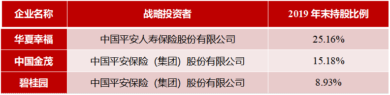 与一般资金相比,保险资金具有资金来源稳定、成本较低、期限较长等优势。近年来,万科、保利、招商蛇口、华夏幸福等房企纷纷引入险资,部分险资企业已持有多家房地产上市企业股份。目前,中国平安已经成为华夏幸福、中国金茂、碧桂园的第二大股东。其中,华夏幸福自2018年首次引入中国平安,截至2019年末,中国平安在华夏幸福的持股例比例已经达25.16%。