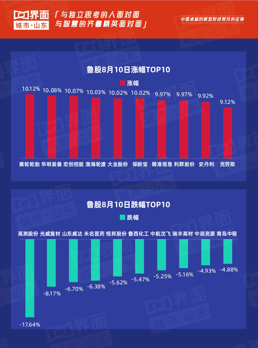 8月10日,山东省内沪深股票有138只个股上涨,79只个股下跌,其中渤海轮渡、华明装备、宏创控股、渤海轮渡、大业股份、保龄宝、精准信息、利群股份、史丹利涨停。
