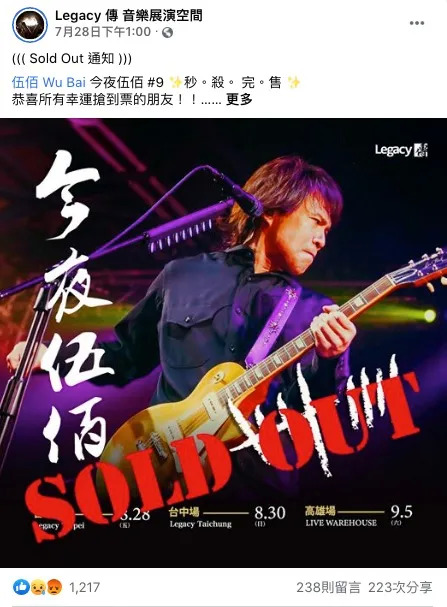 因为演出场场售罄,Legacy 十周年派对上,伍佰 & China Blue 受封“秒杀之王”