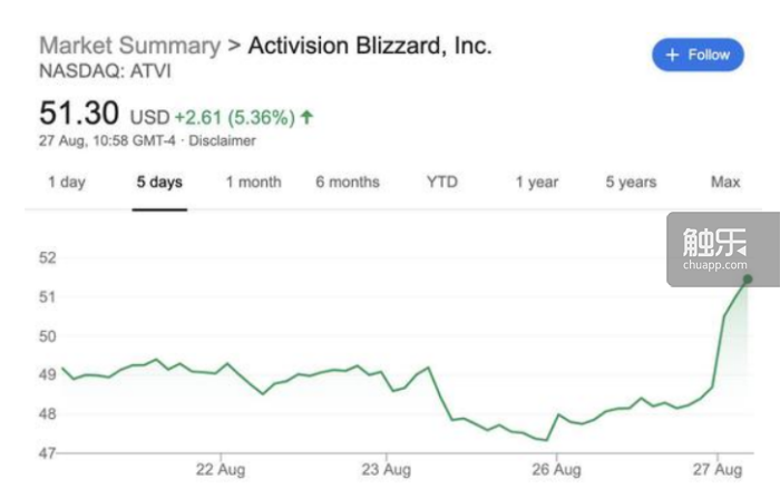 怀旧服带来的人气大大超出暴雪预期,购买月卡的玩家明显增多,连带着公司股票也水涨船高,扭转了此前的下降趋势。动视暴雪股价在怀旧服上线一天内便暴涨近6%,这是自2018年11月以来的最高峰。