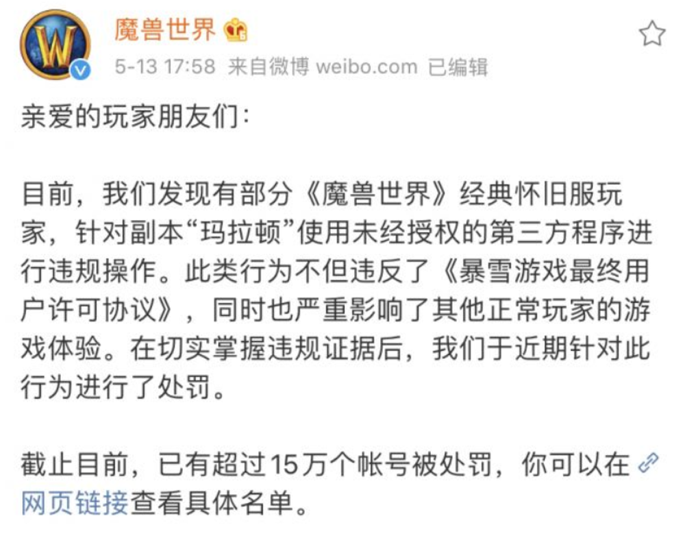 有的人可能会疑惑,脚本也好,外挂也罢,这么明显的危害游戏的东西,运营者怎么不管管呢?事实是,他们在对待工作室脚本的问题上几乎没有实质性作为。从开服到2020年5月,官方累计冻结过15万个游戏账号,这个数量相对怀旧服存在的脚本号而言是九牛一毛,而且大多都只冻结1个月,解封了又是一条刷钱好汉。暴雪针对脚本大军做了两次热修,先增加了黑莲花刷新地点,又对玩家设立了一个每日30次副本的限制,但收效甚微。