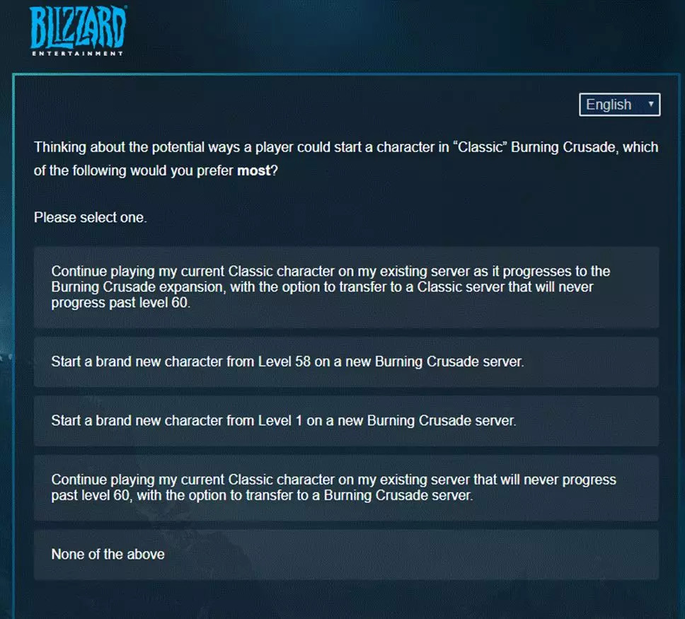 最后,在2020年3月28日,暴雪曾向《魔兽世界》玩家发出过一个问卷调查,内容是怀旧版《燃烧的远征》应采用怎样的升级机制,并提供了数个方案供玩家选择。很显然,这是在为《燃烧的远征》怀旧服做准备,相信等纳克萨玛斯也被玩家攻克后,黑暗之门就会开启了。当燃烧再远征、巫妖王再怒之时,等待老玩家的是过去的美好回忆,还是赚金的牛鬼蛇神呢?