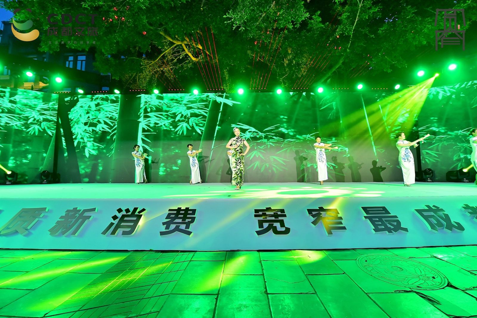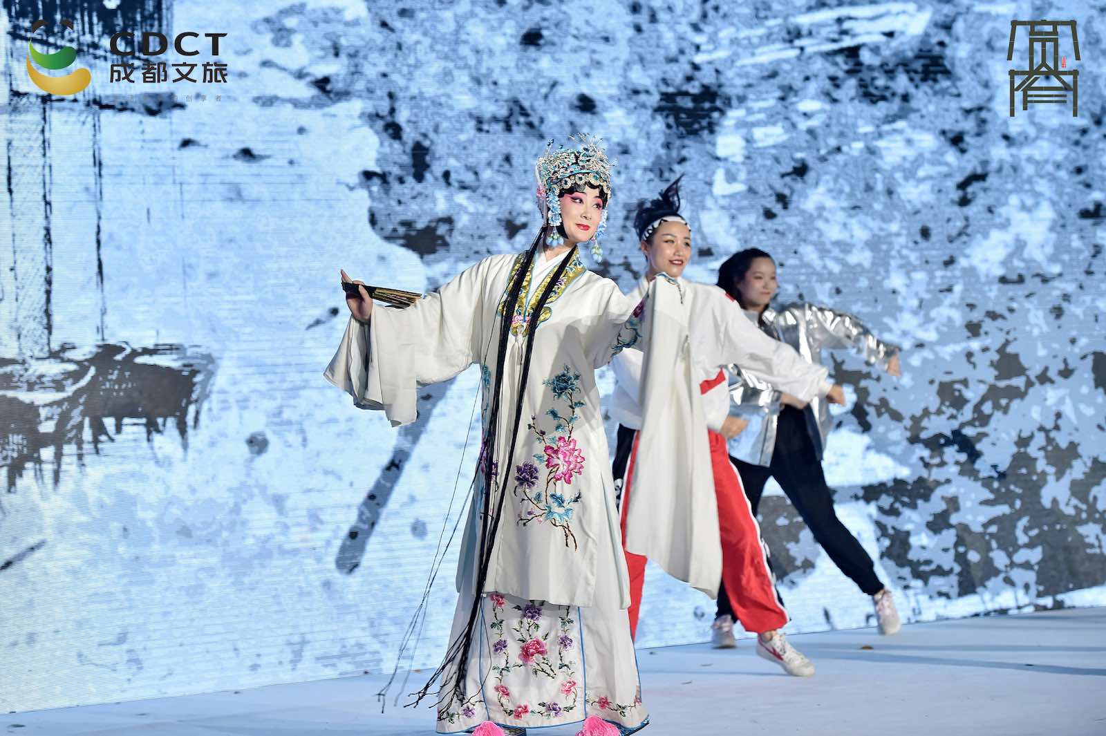 接下来的环节以“漫步天府 川流不息”为主题,巧妙地结合了川剧特色,原创新川剧场景秀,通过“视频+新川剧唱作”的方式将铁像寺水街、镋钯街、奎星楼街、猛追湾/望平坊、安仁古镇、凤凰水街、宽窄巷子等7个特色街区雅集场景串联起来,令人应接不暇,充分展现出成都丰富的消费场景和文化特色。