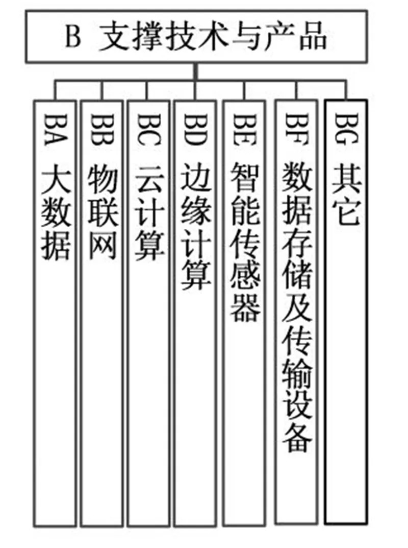支撑技术与产品标准主要包括大数据、 物联网、 云计算、 边缘计算、 智能传感器、 数据存储及传输设备等部分, 如下图所示。