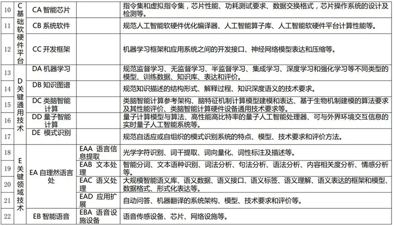 1)、 智能芯片标准。规范智能计算芯片、 新型感知芯片及相关底层接口等, 为人工智能模型的训练和推理提供算力支持。包括指令集和虚拟指令集、 芯片性能、 功耗测试要求、 数据交换格式、 芯片操作系统的设计及检测等标准。