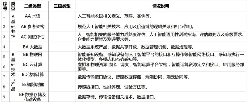 1)、 大数据标准。规范人工智能研发及应用等过程涉及到的数据存储、 处理、 分析等大数据相关支撑技术要素, 包括大数据系统产品、 数据共享开放、 数据管理机制、 数据治理等标准。