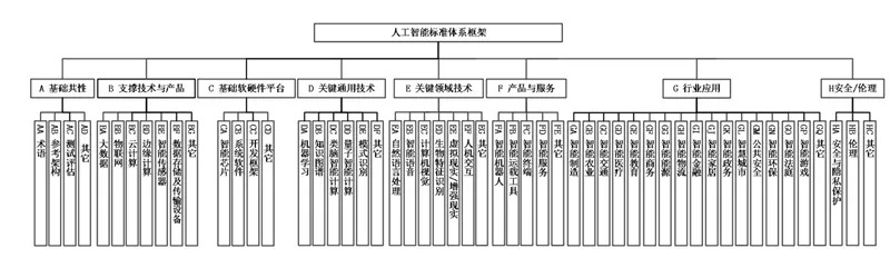 人工智能标准体系结构包括“ A 基础共性” 、 “ B 支撑技术与产品” 、 “ C 基础软硬件平台” 、 “ D 关键通用技术” 、“ E 关键领域技术” 、 “ F 产品与服务” 、 “ G 行业应用” 、“ H 安全/伦理” 等八个部分, 如下图所示。