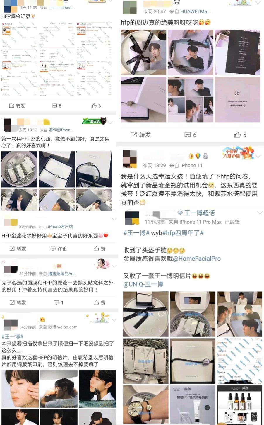 以上好评来自“自来水”、成分党、敏感肌、王一博粉丝……在微博搜索品牌关键词,就能直观感受到HFP的“吸粉”能力。