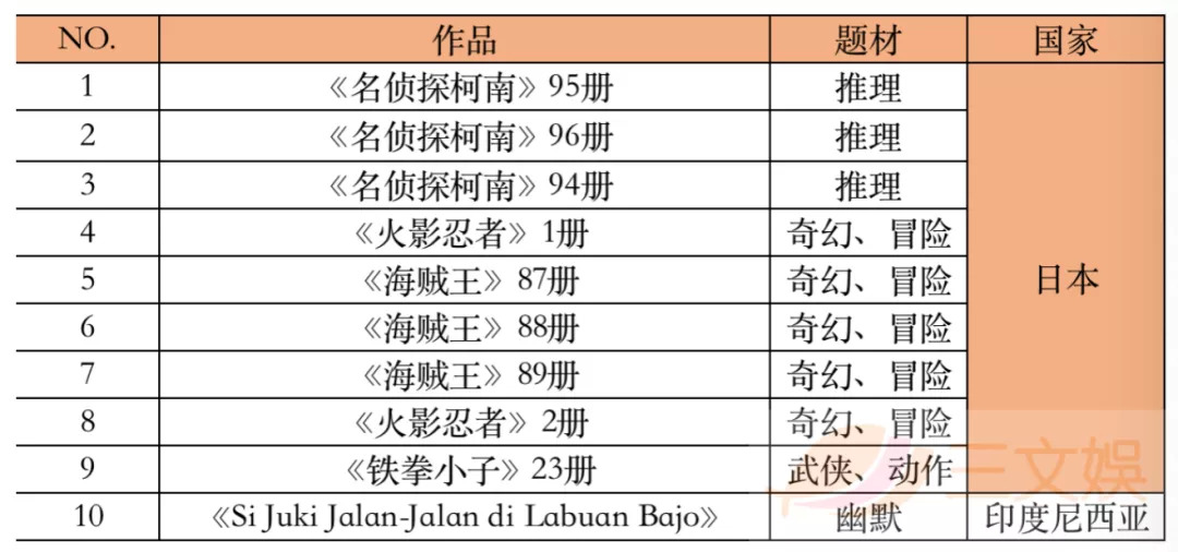虽然电子漫画市场的规模在逐年增加,但截止到现在,纸质漫画依旧是拥有着庞大的市场。而在纸质漫画市场中,日本漫画以几乎垄断式的地位占据着整个市场的份额。据印尼的漫画出版公司Elex Media的调查发现,销量前十的漫画作品中,9部作品就来自日本,其中《名侦探柯南》和《海贼王》还分别上榜了三部作品。