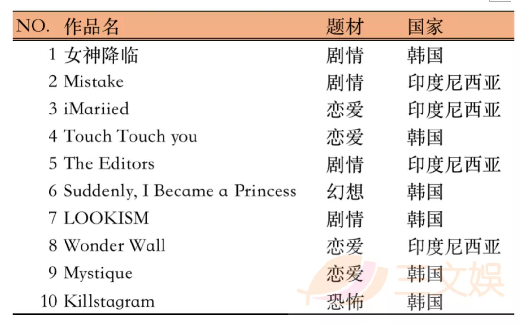 在印尼受欢迎的漫画题材为剧情、恋爱。以2020年7月份为基准,在印尼销量前10的漫画作品中,有4部剧情题材的漫画、4部恋爱题材的漫画,而且有6部作品都是韩国的漫画,而剩下的4部是印尼本土的漫画作品。