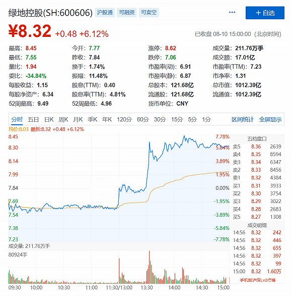 8月10日,受益于免税牌照的消息,绿地控股股价午后大幅上涨,收于8.32元,涨幅约6.12%。