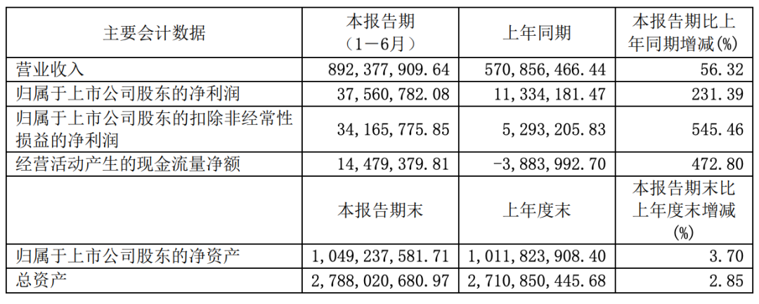 2020年上半年,广东骏亚实现营业收入8.92亿元,同比增长56.32%;归属于上市公司股东的净利润3756.08万元,同比增长231.39%;扣非净利润3416.58万元,同比增长545.46%。