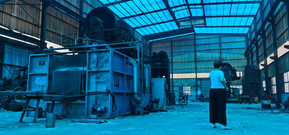 工厂办公楼后是三间大厂房。目前,仅有出租的那间厂房正在运作。第二间厂房空关。苏银霞想着用这间空厂房发展一些新业务。第三间厂房是锻造车间,也曾是工厂的心脏。如今,厂房外因为一场大雨积水、通道泥泞;厂房内映着遮阳棚的蓝色,设备、杂物积满灰尘,还遍布蛛丝和白杨絮。苏银霞跳过水潭,扶着堆在厂房门口的设备,跨进厂房查看。“最近一个变压器和设备里的铜线都被偷了。”她说。