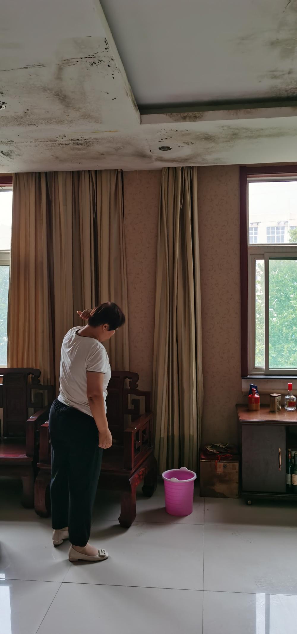 山东源大工贸有限公司3层的招待餐厅天花板渗水了,霉斑遍布。工厂负责人苏银霞见状,很心疼。她端来粉色水桶,想接住从天花板上滴落的雨水。一家人入狱前,这里是招待重要客户的小餐厅,实木大圆桌、真皮沙发、整体橱柜一应俱全。