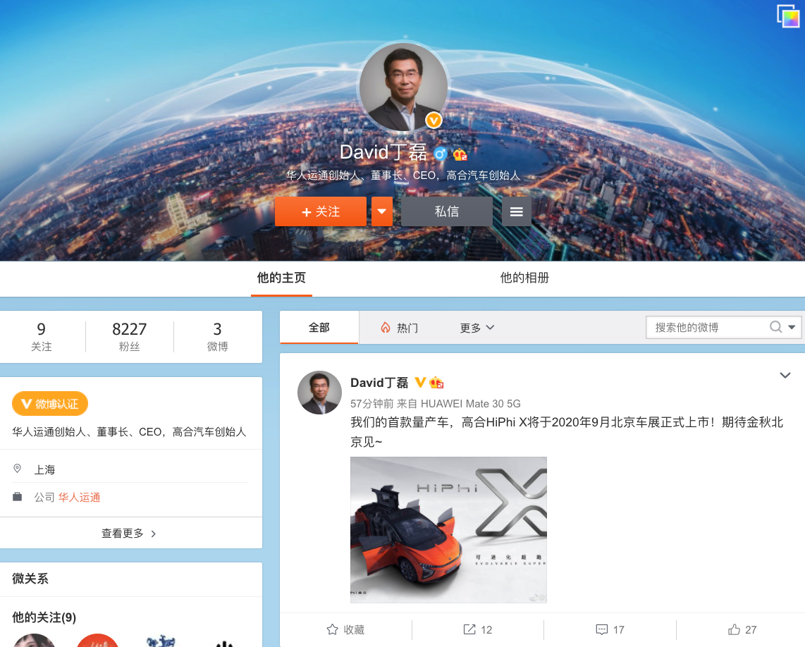 此前的微博“AUTO丁磊”注册于2015年9月1日,尽管只发布过22条微博,但却是一个拥有超过100万粉丝的“大V”。“AUTO丁磊”的更新停留在2016年7月20日一条通过乐Max 2手机发布的内容: