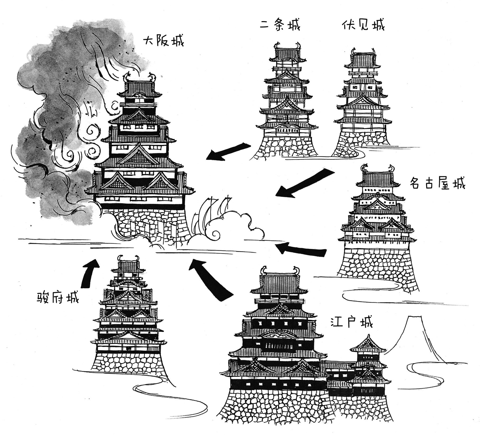 江户城一经完成,德川家康便开始在骏府(静冈县)建造自己的隐居城。1607年年底,隐居城虽然一度竣工,但在一场大火中付之一炬,翌年再度建造。1610年,德川家又建造了名古屋城。