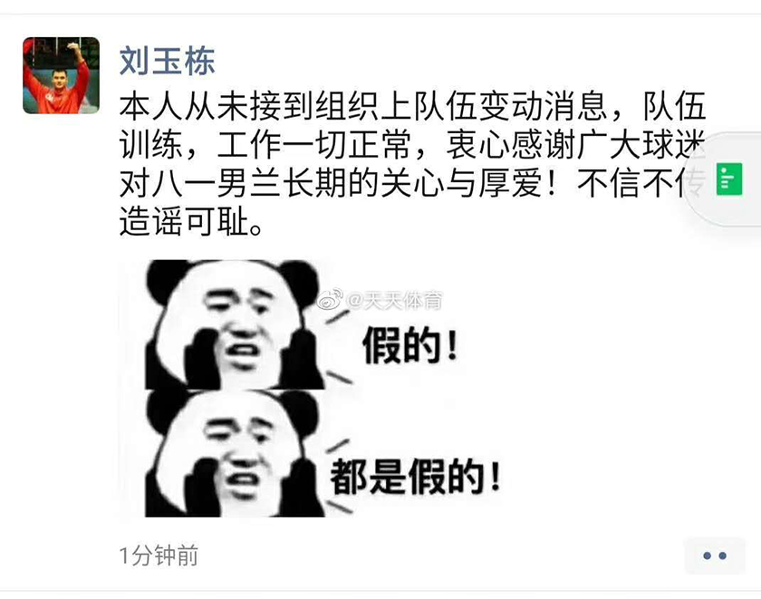 不过,传闻发酵后,八一男篮领队刘玉栋发布朋友圈辟谣:“本人从未接到组织上队伍变动消息,队伍训练,工作一切正常,衷心感谢广大球迷对八一男兰(篮)长期的关心与厚爱!不信谣不传谣,造谣可耻。”