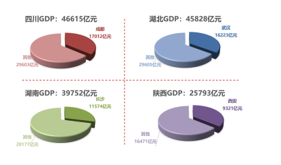 成都GDP约占四川GDP的36.5%;武汉GDP约占湖北GDP的35.4%;长沙GDP约占湖南GDP的29.12%;西安GDP约占陕西GDP的36.14%。