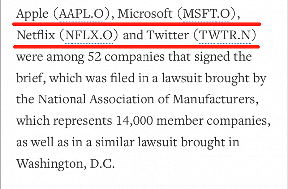苹果、微软、Netflix和Twitter在内的52家企业都签署了这份诉讼文件,由美国全国制造商协会(National Association of Manufacturers,简称NAM)在加州发起。该组织是美国最大的制造业工业贸易协会,代表全美50个州各工业领域14,000个小型和大型制造业公司。