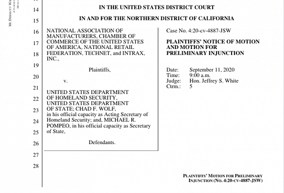 事实上,由于该项限制令,早在7月21日,美国商会(USCC)就联合了全国制造商协会、美国零售联合会(NRF)、TechNet、国际培训与交流组织(Intrax)等多个行业协会对美国国务卿蓬佩奥与代理国土安全部长查德·沃尔夫提起了诉讼。