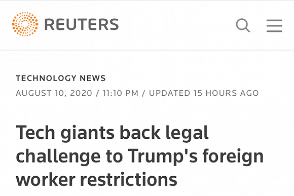智东西8月11日消息,据路透社报道,美国当地时间8月10日,亚马逊、Facebook、苹果、微软等52家美国科技公司联合提交了一份法律文件(legal brief),支持起诉特朗普的外籍劳工入境禁令。