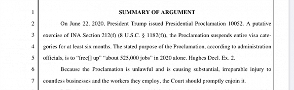 本次起诉的发起组织是美国全国制造商协会(NAM),其在7月31日发布的一份文件中表态:“由于该公告(外籍劳工入境禁令)是非法的,并且对无数企业及其雇佣的工人造成了实质性的、无法弥补的伤害,法院应立即下令禁止它。”