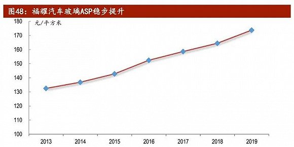 如果从更长的周期来看福耀玻璃,公司未来的成长性与确定性会更高。一方面,全景天窗、HUD(抬头显示)、防紫外线玻璃等汽车玻璃领域的新科技产品的渗透率正在不断提升。数据显示,福耀汽车玻璃ASP(平均单价)已由2013年的132.5元/平方米上升至2019年的173.8元/平方米,年复合增长率达到4.6%。在汽车玻璃结构优化以及消费升级的背景下,这一趋势仍在继续。