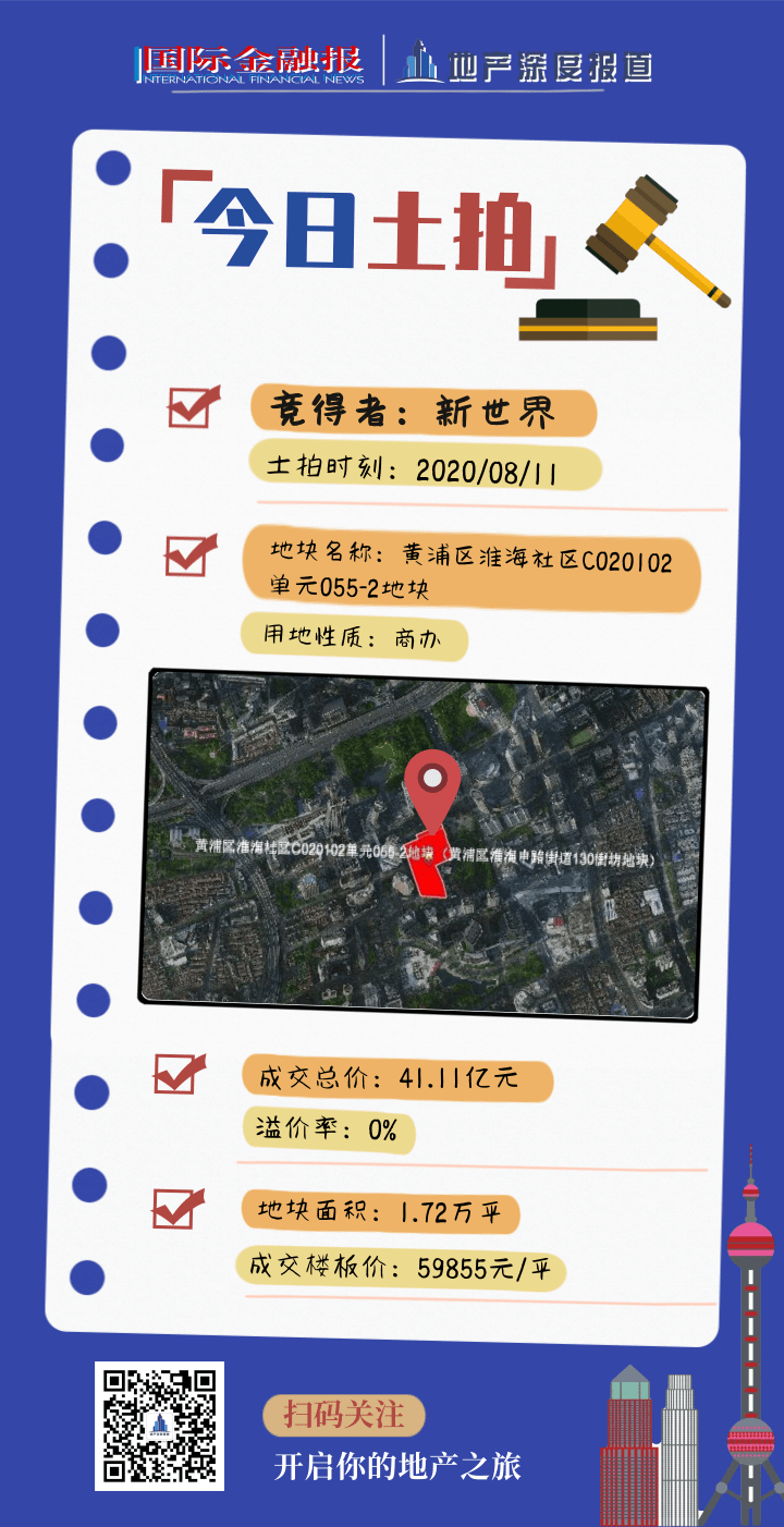 此次新世界拿下的黄浦区淮海社区C020102单元055-2地块(黄浦区淮海中路街道130街坊地块),占地面积17175平方米,地上容积率4,包含2.4w平方米的商业以及4.4w平方米的办公,建筑限高120米。