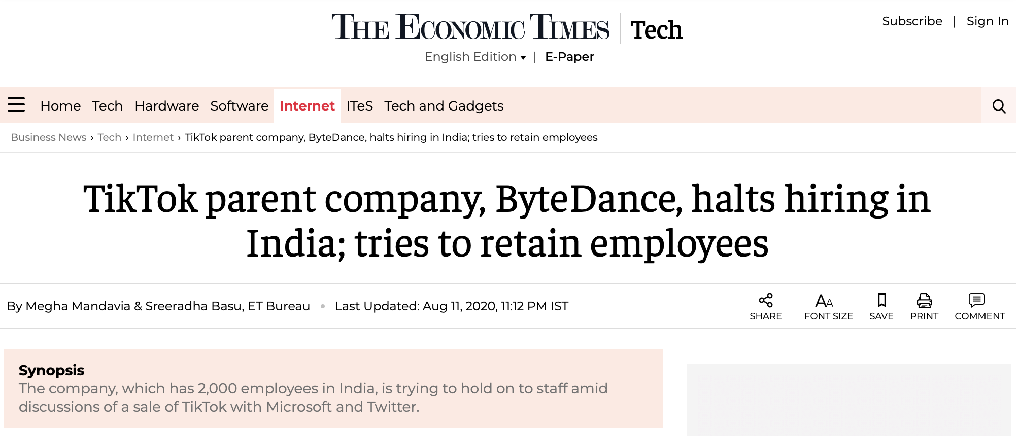 据印度《经济时报》11日报道,据多位知情人士透露,TikTok母公司字节跳动已在印度暂停招聘,并重新分配了部分管理职位,一些员工正在寻求离职。