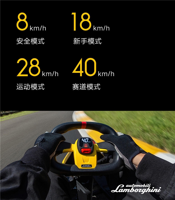 全新升级的动力配置,带来驾驶体验全面升级。动力系统上,九号卡丁车Pro兰博基尼汽车定制版配备两个全新风冷式大功率轮毂电机,可以让卡丁车最大时速达到惊人的40km/h,电机采用双重散热结构,峰值性能维持更久,1.02G的加速度,带来推背感十足的畅快体验。这个时速已经很快了,再加上卡丁车底盘低,贴地驾驶时的感觉会比实际高3~4倍的速度,相当刺激。