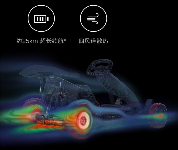 续航方面,九号卡丁车Pro兰博基尼汽车定制版配备了432Wh超大电量电池,满电状态下典型续航25KM,相当于连续在400米赛道上开62圈。电池组采用四风道散热设计,即使在车辆极速状态下,也能保持稳定的能量供给,更持久更畅快。