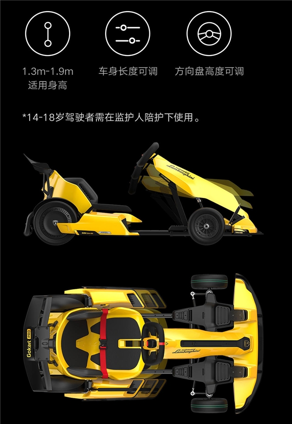 它外观采用兰博基尼专属配色,车身印有兰博基尼金属LOGO,黄黑搭配辨识度非常高,很对当下消费者的审美和胃口,这种充满设计感的外观,就算是遮住了车上的LOGO,回头率也是100%。外观亮眼,内部也有料,高强度的钢制车架有效载重高达100kg,带来更好的防护性能,可有效应对高速度下的路面冲击;车身可伸缩,有4档长度可调节,方向盘高度也可调节,从1.3m的小朋友,到1.9m的大个子,都能驾驭,车架还可以折叠,在完全折叠后可放入大部分汽车的后备箱中,方便运输。