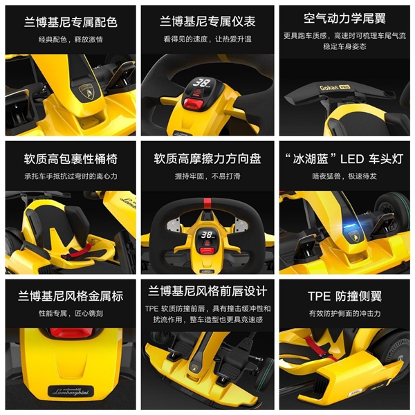 该款卡丁车整车多个部位都融入了经典兰博基尼元素,比如方便夜晚驾驶的“冰湖蓝”LED车头灯、握持牢固的兰博基尼风格软质高摩擦力方向盘和可显示速度/驾驶模式的兰博基尼专属仪表,方向盘上还有一个红色的回正标识,更具赛车风格。车头和侧面设计有兰博基尼风格TPE软质防撞前唇和TPE防撞侧翼,带来更好的撞击缓冲性能及驾驶安全性,避免轻微撞击带来的问题。