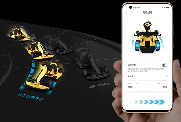 九号卡丁车Pro兰博基尼汽车定制版车身前后配重比为40:60,加速快,车尾灵活,由于使用了电机作为动力来源,所以踩下“油门”后的动力响应相当迅速,这是一般汽油卡丁车所不能带给你的感受,起步瞬间几乎就可达到最大扭矩,传动相当直接、高效,高速过弯时,可享受反打方向救车的刺激体验。而且,该款卡丁车还拥有专属的动力矢量分配系统,可以通过App调节内外侧车轮动力,使车辆更偏“甩尾”或者更偏“推头”,从而改变过弯特性,感受不同的驾驶乐趣。