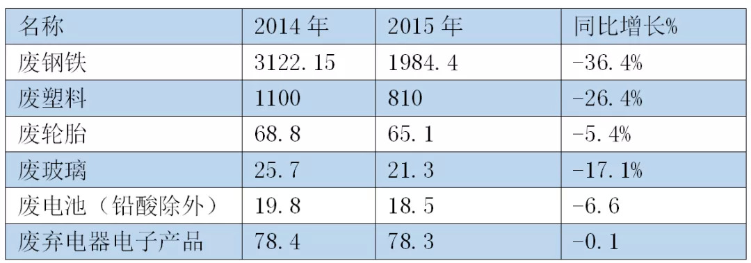 2015年,我国十大品种再生资源回收总值为5149.4亿元,受主要品种价格持续走低影响,同比下降20.1%。其中,废钢铁价格大幅下降,降幅高达36.4%,历史罕见。