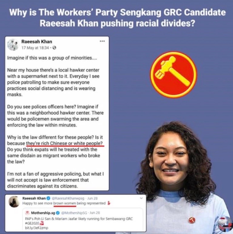 今年5月17日,新加坡工人党代表Raeesah Khan在Facebook上针对社交隔离监管的实施中对少数族裔、华裔富商以及旅居白人的区别对待发出质疑。她转载了一条“阻断期间”(Circuit Breaker,指新加坡从4月7日到6月1日实行的一系列控制疫情的措施,其中禁止不同住的家人或者朋友聚会)7名外国白人违反社交隔离规定聚集在罗伯逊码头的视频,并评论称: