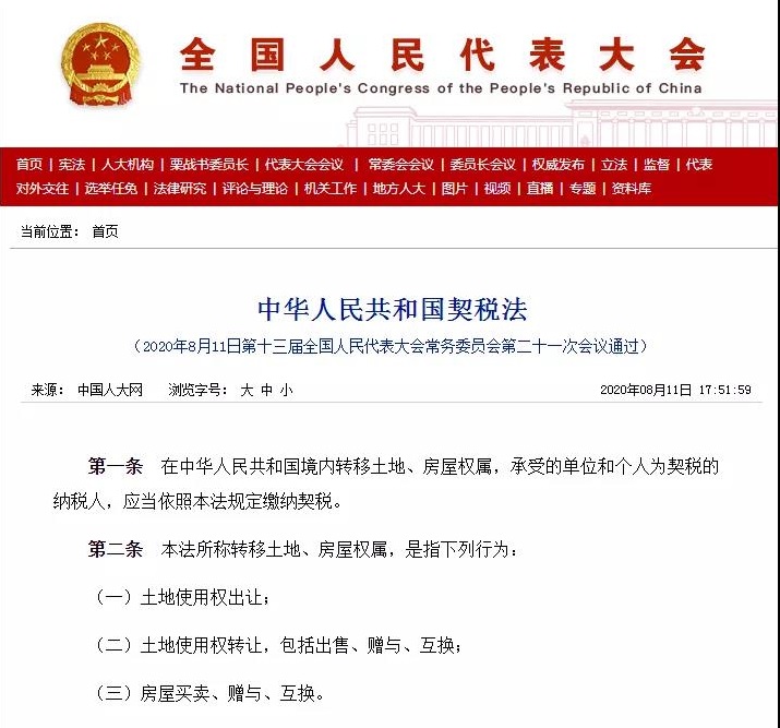 2020年8月11日,第十三届全国人民代表大会常务委员会第二十一次会议通过《中华人民共和国契税法》,自2021年9月1日起施行。