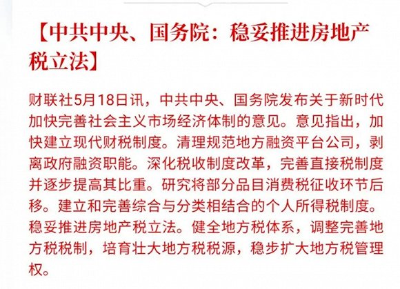 今年两会之前,5月18日,中央发布《关于新时代加快完善社会主义市场经济体制的意见》,其中明确提及:稳妥推进房地产税立法。健全地方税体系,调整完善地方税税制,培育壮大地方税税源,稳步扩大地方税管理权。