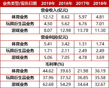由此,星辉娱乐近年来形成了体育、玩具、游戏三大业务板块,其中体育业务稳步增长,收入占比持续扩大。