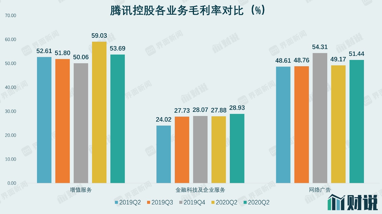 在各项业务营收增长的同时,腾讯各项业务毛利率也有较为明显的增长。包括游戏和数字内容的增值服务业务毛利率同比提升1.08个百分比至53.69%,金融科技及企业服务提升近5个百分点至28.93%,网络广告业务提升2.83个百分点至51.44%。这在今年这一特殊情况下尤为难得。