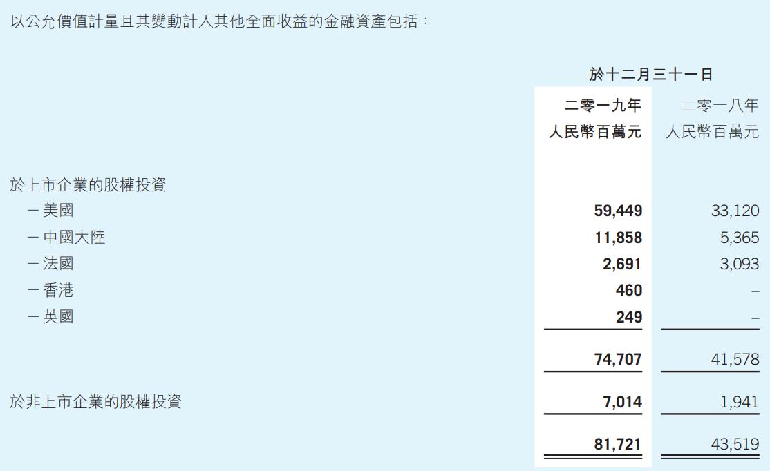 众所周知,腾讯以“广撒网“式的投资在业内闻名。在财务上则反应为两部分,以公允价值计量且变动计入损益的金融资产,以及以公允价值计量且变动计入其他全面收益的金融资产。前者的投资收益被计入当期利润,后者则被计入权益不影响利润。根据2019年年报披露,以公允价值计量且其变动计入其他全面收益的金融资产以上市企业的股权投资为主,其中以在美国上市公司的股权投资最多。
