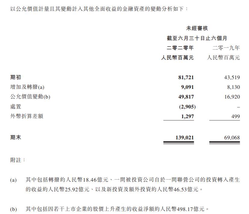 在腾讯的一季报中,由于股市下跌,该项目公允价值变动为-75.11亿元,而到二季度,纳斯达克指数创出新高,腾讯在股市的投资也获得了丰厚回报,财报显示,腾讯以公允价值计量且其变动计入其他全面收益的金融资产中,2020年上半年因若干上市企业的股价上升产生的收益净额为498.17亿元。