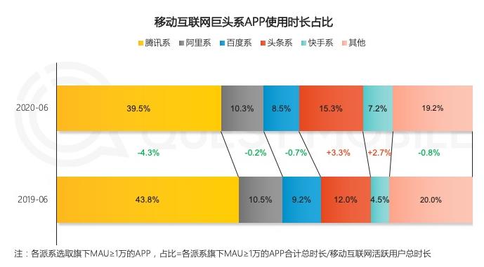 当然,二季度乘风破浪的腾讯并非没有隐忧。根据Questmobile的统计,腾讯系2020年6月的用户时长占比为39.5%,同比下滑4.3%,相比2020年3月也下滑了3.7%。面对用户时长持续被头条系抢占,腾讯目前只是通过入股快手,加大在B站的投资来“曲线救国”,这恐怕不能解决根本问题。